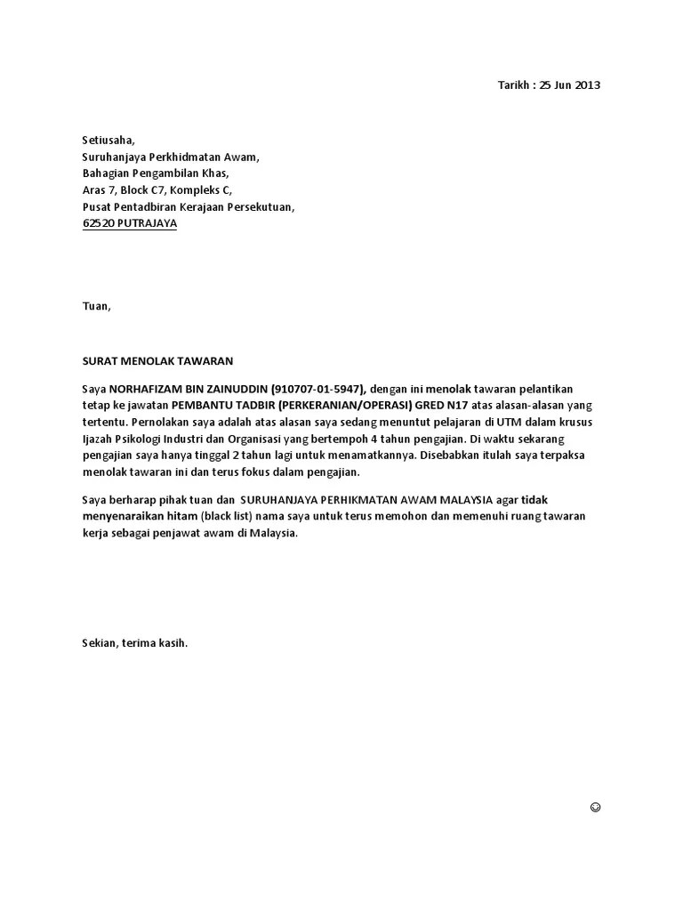 Ungkapkan alasan dengan jelas · after careful consideration, i've decided to not accept the position as it doesn't fit my previous background . Find out the most recent pictures of contoh surat tolak tawaran kerja dalam bahasa inggeris here, and also you can get the picture here simply. Tolak tawaran kerja dengan tidak lupa berterima kasih dan bila perlu mengungkapkan alasan. I cannot eccept the job offer (dengan .